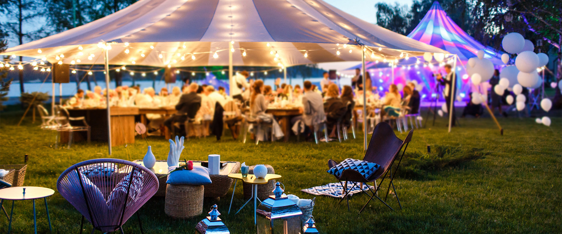 Decorate the ceiling of the tent with lights along with strings of lights wrapped around the trees. You could even hang or place lights on tables and on shrubs and bushes as it gives an ethereal look to the entire ambiance.