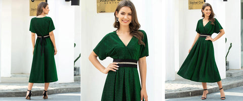 Bored of wearing long gowns? The try this short frock which gives you a different look as it is featured with deep V neck and ruffle sleeves. The length of the dress is below the needs and you can easily move in the party. The wide belt on the waistline enhances your features and you can pair black heels with it to have a nice look.