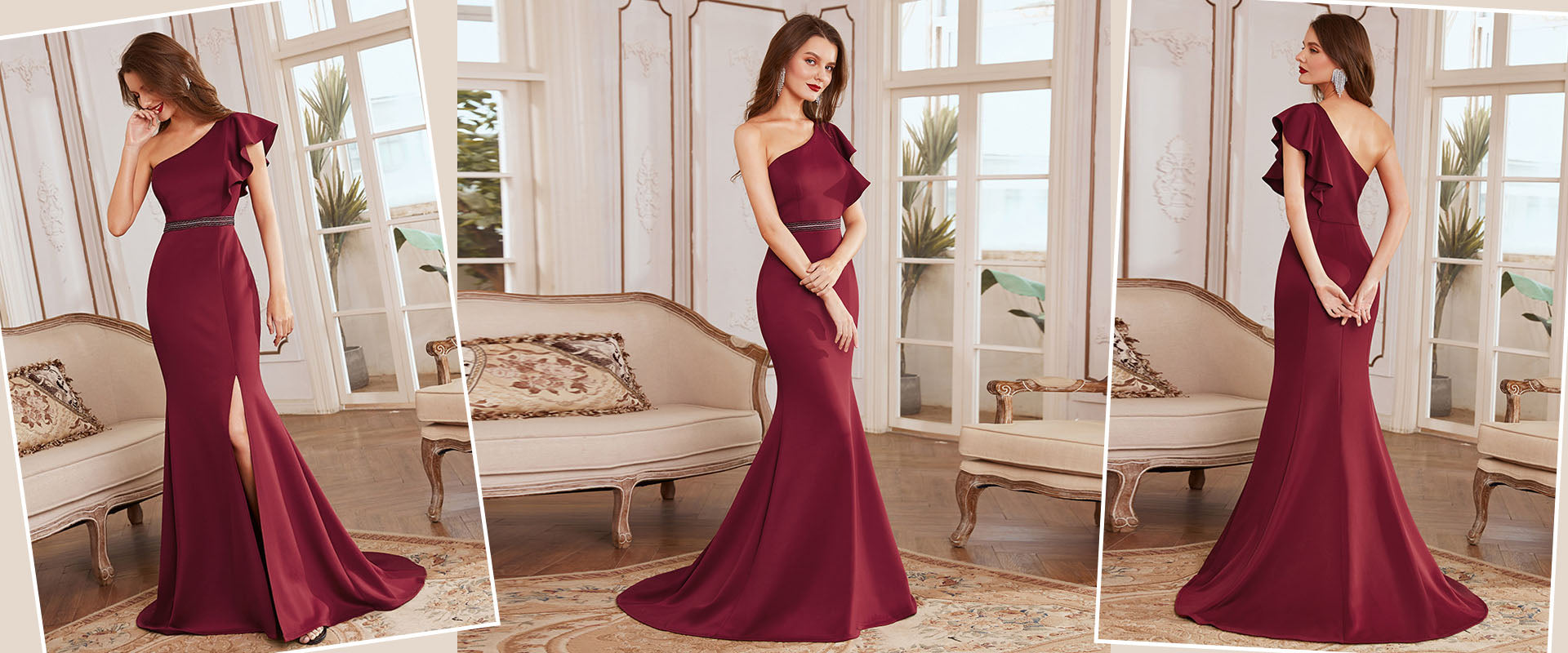 Our show-stopping party look is an off-shoulder ruffle sleeve dress that has a thigh high slit. This dress is a stunner by itself. An off-shoulder dress looks incredibly chic, and when combined with a high slit, it looks uber feminine. Our designers predict that this trend of off-shoulder wholesale evening dresses is here to stay as it is an extremely flattering style that suits most body types. The dress has a fishtail silhouette and also comes with a waist belt that cinches the waist to give an immaculate shape to the figure of the wearer.