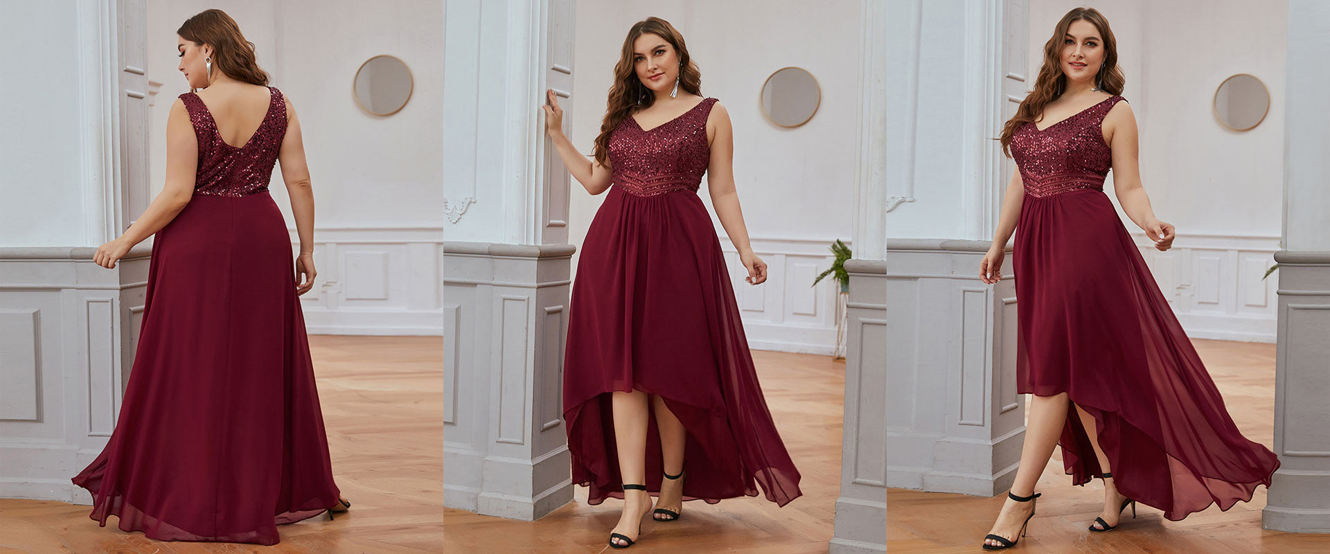 A high-low dress shows the playful side of your personality thereby making you the life of any party. A flowy asymmetrical gown in a deep V neckline is both fashionable and sexy at the same time. Wear evening dresses plus size in metallics or deep colors to add to the richness of the dress. Make it stand out by pairing it with a sequin belt right at the waist.