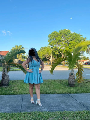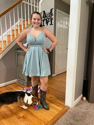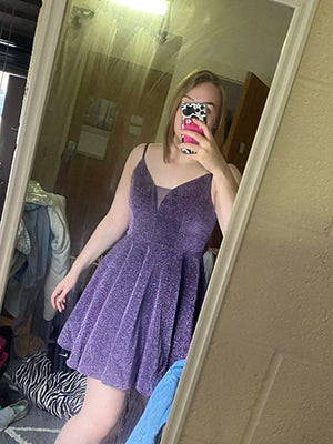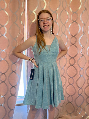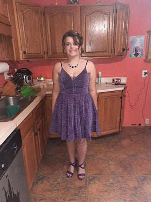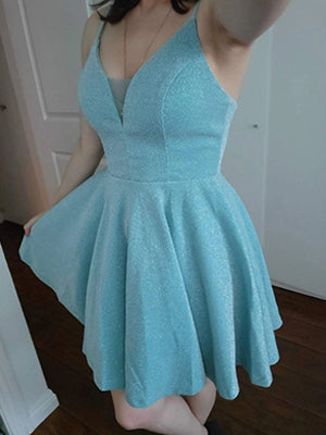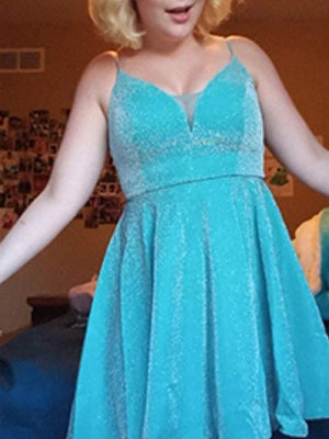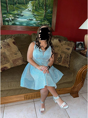 Make your customers happy and permanent by having this prom dress. The customers know that a pretty dress is hard to find and they will purchase it readily. The prom dress has spaghetti straps and also features a deep V-neck. The length of the dress is short and is above the knee.