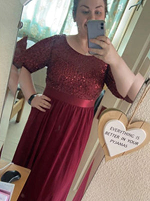 This sparkling plus size evening dress features a classic round neckline, half sleeves and a flowy A-line skirt which is friendly to most people. The ribbon in the waist helps to define your curve! We think this stunning evening dress is perfect for evening party, cocktail, prom, homecoming, graduation, weddings, and any other formal affair!