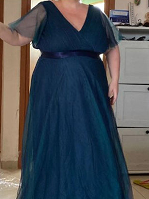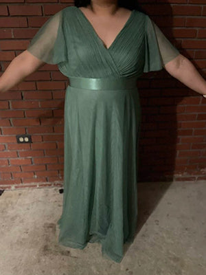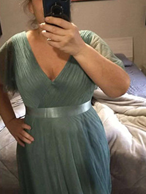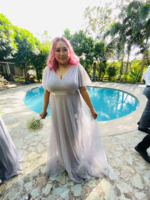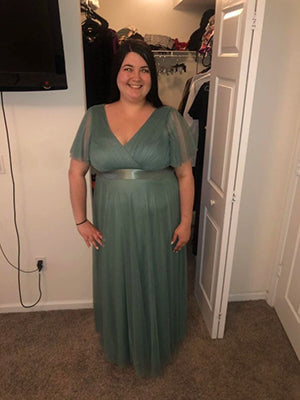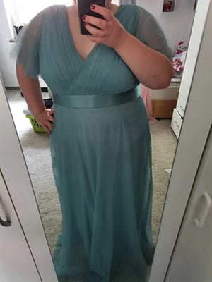 This romantic plus size wholesale bridesmaid dress features a deep V neckline,empire waist flutter sleeves,and subtle high low tulle hemline.It is friendly to most body types.We think this elegant evening dress is perfect for all formal occasions,from evening party,cocktail,weddings to prom,homecoming and graduation!