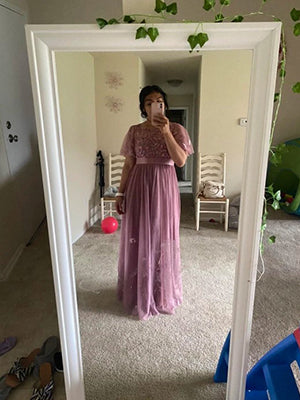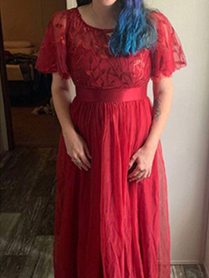 Featuring a classic round neckline, ruffle sleeves and a belt design in the waist, this stunning bridesmaid dress is perfect for any wedding. The shimmery leave design also gives a romantic vibe. The plus size dress is perfect for parties, cocktail, prom, homecoming, graduation, weddings, and any other formal affair!