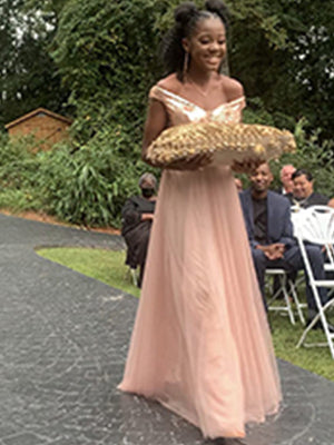 Do you want your customers to look the best? If yes, then this beautiful evening dress should be in your shop. It features off-shoulders and has a deep V neck. The paillettes on the upper part of the dress look really adorable. The length of the dress extends to the floor and this is the type of dress that every customer has been looking for.